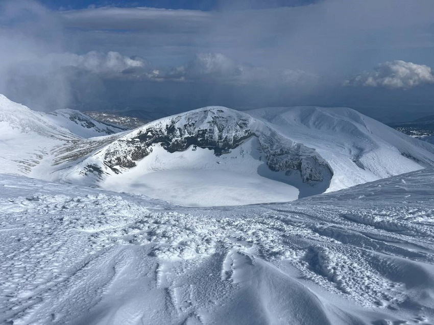 蔵王山(熊野岳)からお釜を望むコースのスノーシュートレッキングガイドプラン。