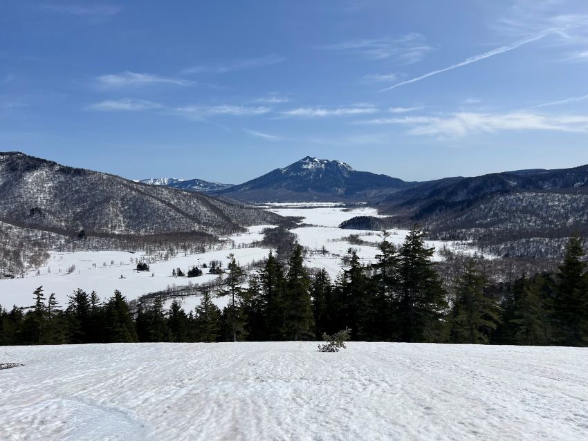 標高が上がるにつれ、振り返れば雪景色の尾瀬ヶ原、正面には尾瀬ヶ原越しに燧ヶ岳が見えてきます。