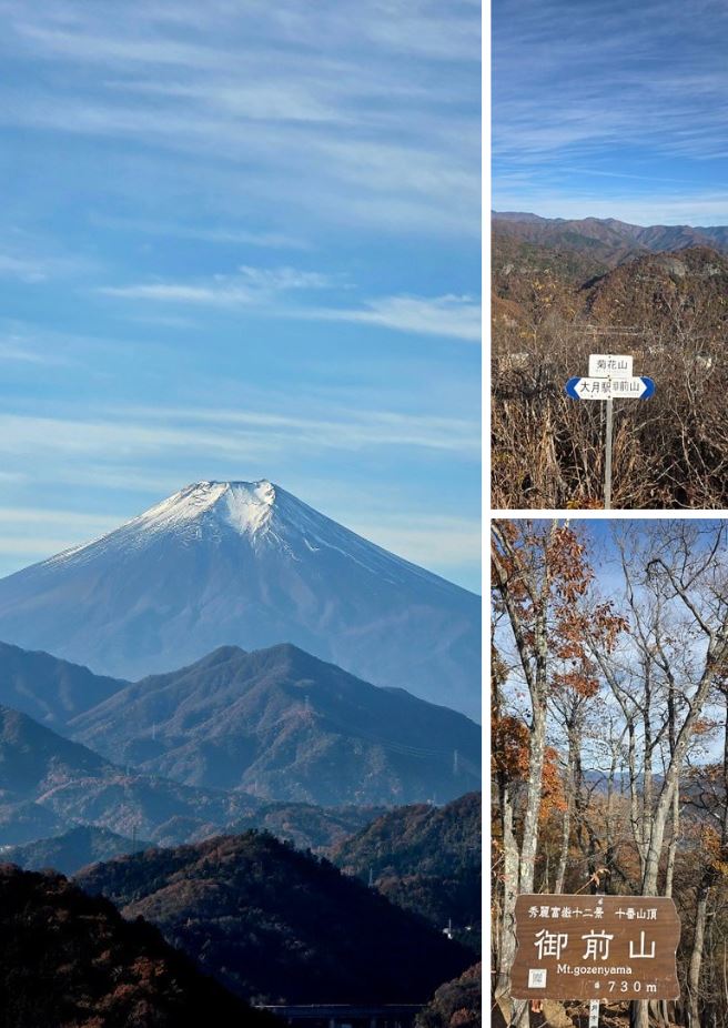 大月駅【集合時間8:00】 ▼ 菊花山 ▼ 菊花山分岐 ▼ 御前山 ▼ 登山道入口 ▼ 猿橋駅【解散予定15:00】 【約5.3㎞/△636m・▽667.9m 約3時間45分】 ※グループに分かれてゆっくりとあるいていきます。 ※場合により下山ルートが変更になる場合がございます。 |