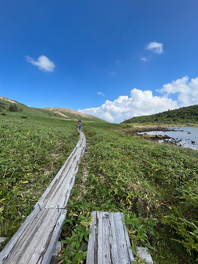 湖畔を歩いて高湯温泉登山口へ下山後は温泉に浸かり旅の疲れを流してさっぱりしてご帰宅できます。