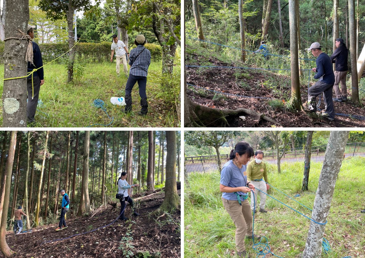 座学で学んだロープワークを実際の自然環境で体験!実際の斜面・立ち木を利用して、学んだ各種のワークをいろいろな場面を想定して実践的に応用していきます。