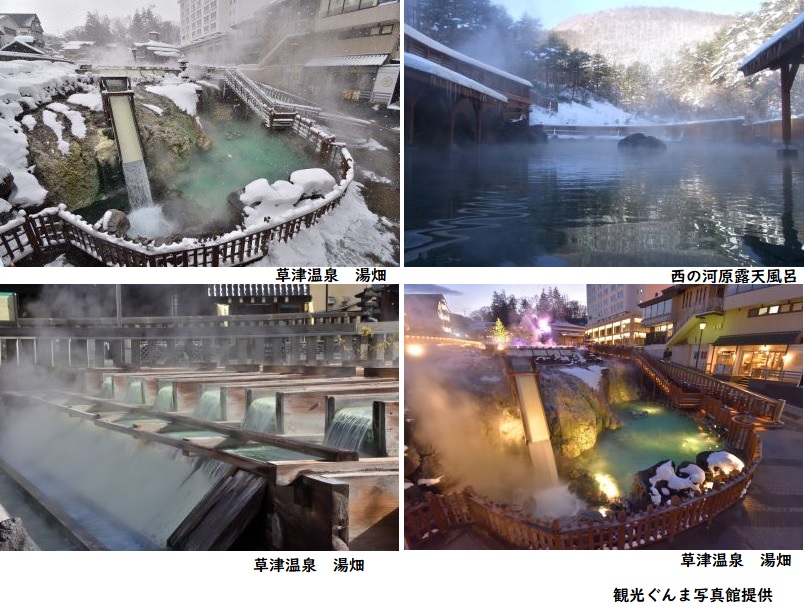 各出発地(熊谷12:00)- 高速道 - 草津温泉(泊) 15:00頃の到着で草津温泉街の散策をお楽しみください。 夕食はグループ毎になります。※宴会はございません。 |