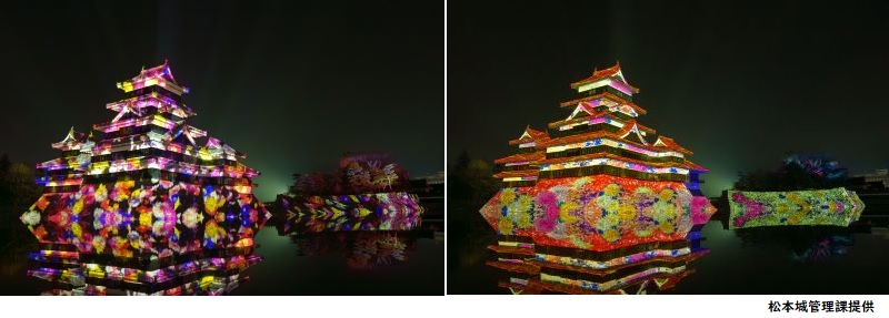 松本城天守と石垣に浮世絵や伝統工芸をモチーフとした壮麗なプロジェクションマッピングを投影。レーザーマッピングとの融合により、歴史と先端技術が織りなす迫力の光の演出が楽しめます。