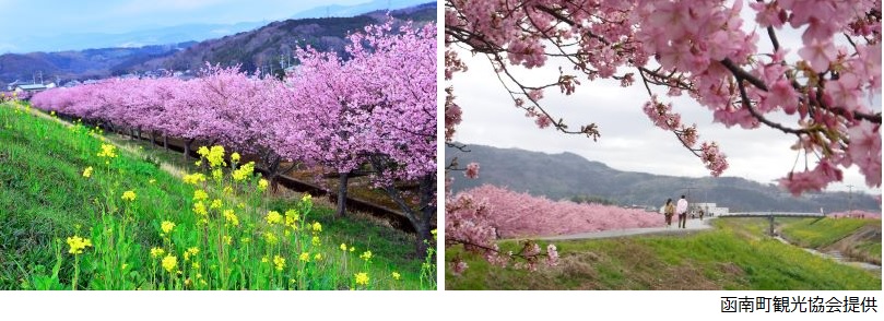 静岡県函南町の春の風物詩「かんなみ桜まつり」。早咲きの「かんなみ桜」が川沿いを鮮やかなピンク色に染め上げ、ひと足早い春の訪れを感じられる人気イベントです。会場となる「畑毛せせらぎ公園」周辺には、約400本の桜が咲き誇り、満開時には桜のトンネルが続く圧巻の景色が広がります。散策しながら写真撮影を楽しむ方も多く、家族連れやカップルにも好評です。期間中は、地元の特産品販売や軽食ブースなども並び、地域の温かい雰囲気に触れられるのも魅力のひとつ。自然豊かな環境の中で、ゆったりと春を満喫できます。